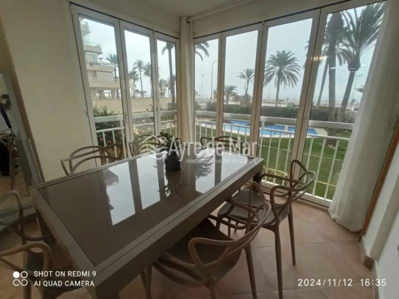 frente al mar en Playa de San Juan. Ubicado en primera línea de playa, frente al Restaurante Niza y a la zona de deportes en la playa. Se compone de 2 habitaciones (1 individual y 1 doble), con armarios empotrados, salón comedor con vista al mar con balcón acristalado con vidrios dobles, con ventanas que se abren en verano para disfrutar de las hermosas vistas al mar y sus atardeceres. Y con persianas para su total cerramiento y obtener mas intimidad. Living con sofá cama de excelente calidad. Cuenta con ascensor y parking. Además, su orientación al mar brinda vistas espectaculares. La comunidad cuenta con jardín y piscina, con hermosas palmeras a su alrededor que se pueden observar asimismo mientras disfrutan del desayuno o las comidas. Este inmueble se vende amueblado, ideal para entrar a vivir o disfrutar en vacaciones con una ubicación privilegiada para cruzar a la playa, para cruzar a hacer deportes o caminar por el paseo de Avda. Niza o simplemente disfrutar de las zonas de ocio de sus alrededores.